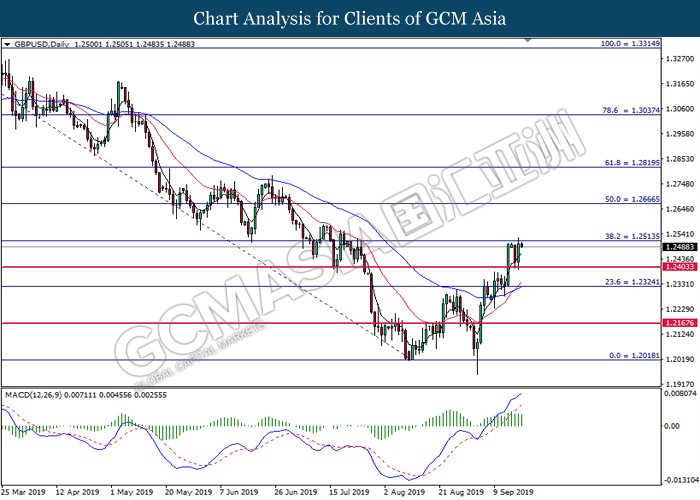 GBPUSD, Daily: GBPUSD was traded higher while currently testing at the resistance of 1.2515. MACD which illustrate bullish bias momentum suggests the pair to extend its gains after closing above 1.2515.