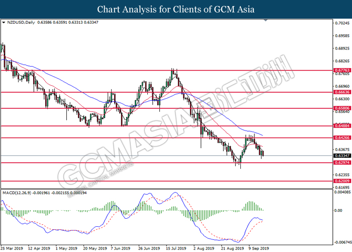 NZDUSD, Daily: NZDUSD was lower following prior retracement from the resistance level at 0.6425. MACD which illustrate diminishing bullish momentum suggests the pair to extend its losses toward the support level at 0.6295.
