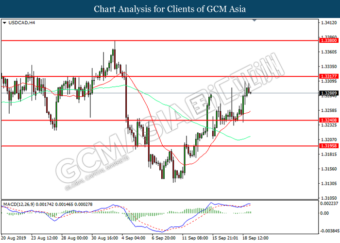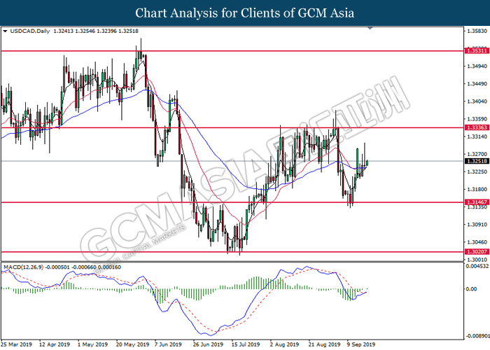 USDCAD, Daily: USDCAD was traded higher following prior rebound from the support level at 1.3145. MACD which illustrate bullish signal suggests the pair to extend its gains toward the resistance level at 1.3335.