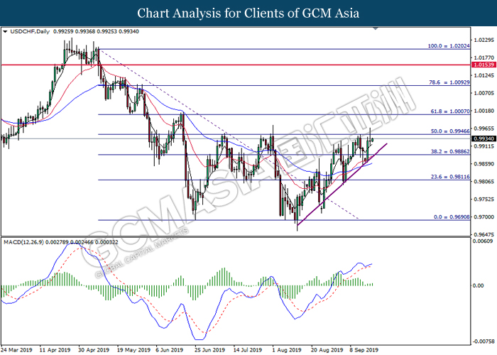 USDCHF, Daily: USDCHF was traded higher following prior rebound from the upward trendline. MACD which illustrate upward momentum suggests the pair to extend its gains toward the resistance level at 0.9945.