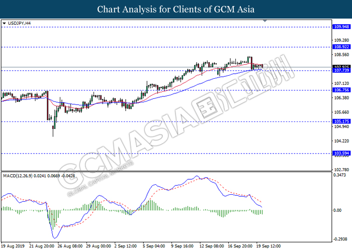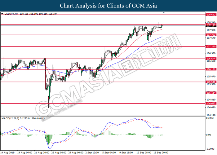 USDJPY, H4: USDJPY was traded higher while currently testing the resistance level at 108.25. MACD which illustrate diminishing bearish momentum suggest the pair to extend its gains after successfully breakout above the resistance level at 108.25.