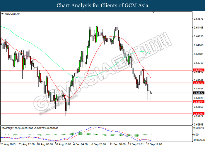 NZDUSD, H4: NZDUSD was traded lower following prior breakout below the previous support level 0.6330. MACD which illustrated bearish signal suggests the pair to extend its losses toward the support level at 0.6295.