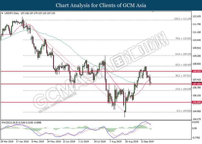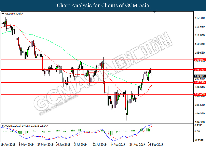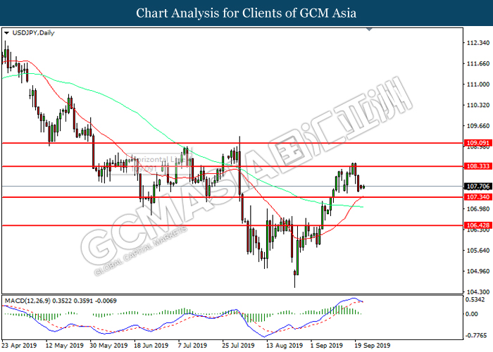 USDJPY, Daily: USDJPY was traded lower following prior retracement from the resistance level at 108.35. MACD which illustrated diminishing bullish momentum suggest the pair to extend its losses toward the support level at 107.35.