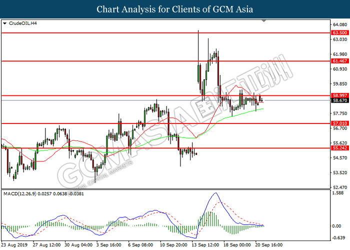 CrudeOIL, H4: Crude oil was traded higher while currently testing the resistance level at 58.75. MACD which illustrate diminishing bearish momentum suggest the commodity to extend its gains after successfully breakout above the 58.80.