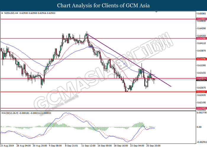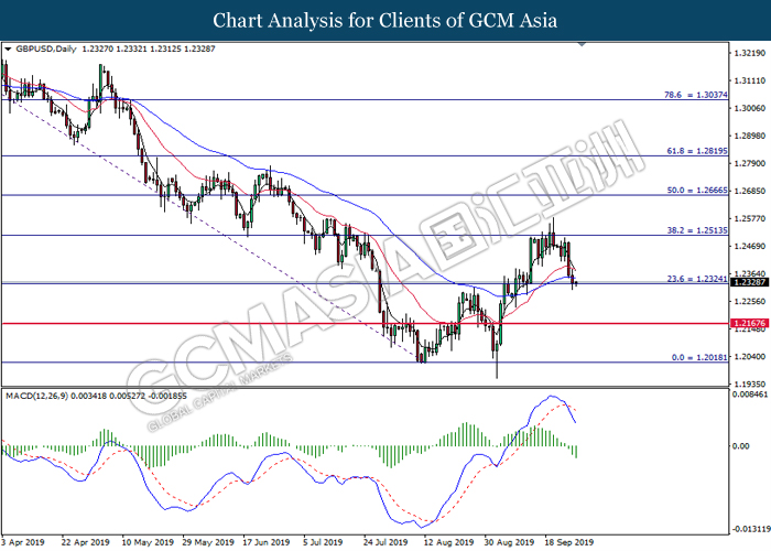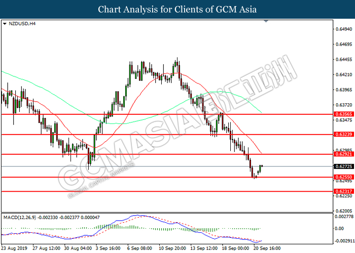 Pound Sterling slump as the soft Brexit hopes seen earlier in the week were unravelled amid a fresh rise in UK political uncertainties. Efforts are reportedly beginning to force Prime Minister Boris Johnson to ask for a Brexit delay sooner rather than later in order to prevent a no-deal Brexit. However, this has led to a rise in fears that the uncertainty of Brexit would persist for months or even year. On the other hand, NZDUSD slump in recent weeks amid to the rumours that the Reserve Bank of New Zealand (RBNZ) was discussing to implement easing monetary policy, spurring the pressure of huge sell-off in New Zealand dollar. Further, New Zealand dollar slump after the ANZ Consumer Confidence for September dropped to a four-year low, falling by 3.6% to 113.9, which providing a weak prospect for the economic outlook. In fact, a sharp fall in Chinese industrial profits also tend to reduce the value of Chinese proxy, the NZD. However, the latest statement from RBNZ was relieving to bearish sentiment of the NZD from investors. According to RBNZ Governor Adrian Orr statement, he claimed that the Reserve Bank of New Zealand (RBNZ) was unlikely to implement expansionary monetary policy amid to stable inflation rate and GDP. In fact, positive development on the US-China trade talk might also provide a bullish support toward NZD. As of writing, GBP/USD rose 0.09% to 1.2332 and NZD/USD appreciated by 0.05% to 0.6296.