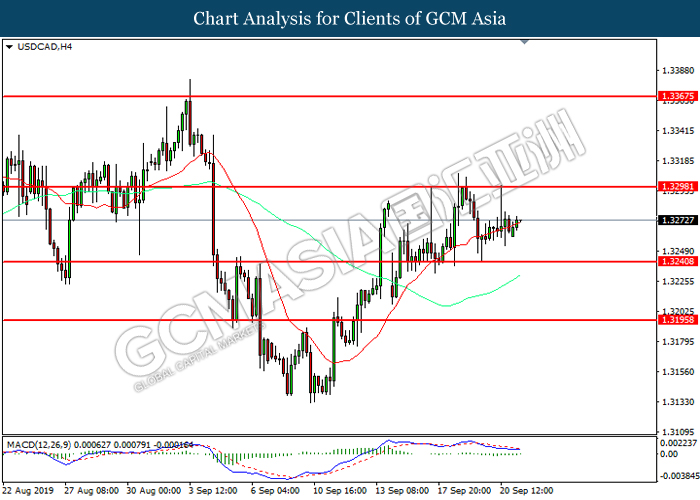 USDCAD, H4: USDCAD was traded in a sideway channel following recent rebound from the support level 1.3235. Due to lack of signal and clear direction from MACD, it is suggested to wait until further signal appear before entering the market.