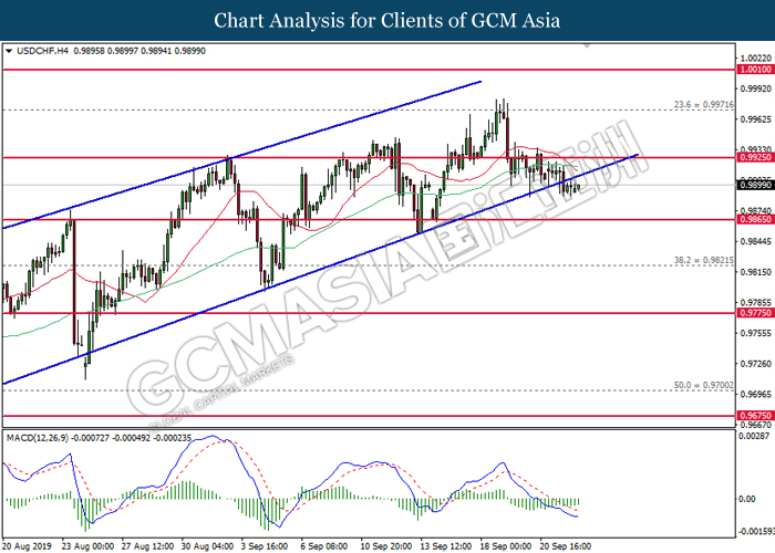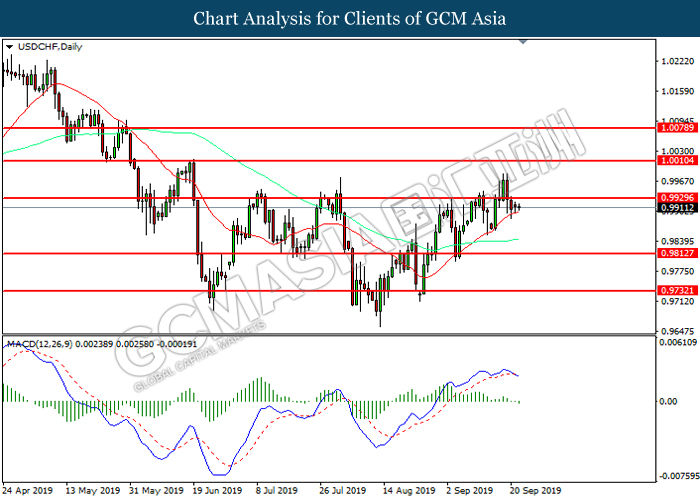 USDCHF, H4: USDCHF was remain traded in a sideway channel while currently testing near the resistance level 0.9940. However, MACD which illustrate diminishing bullish momentum suggest the pair to experience a technical correction in short term towards support level 0.9855.