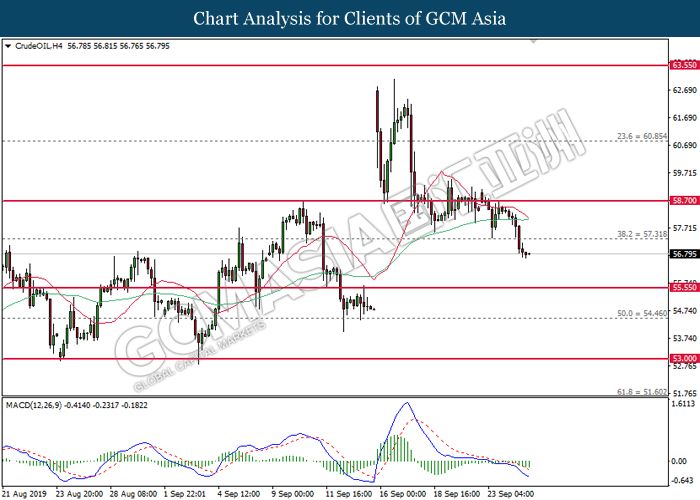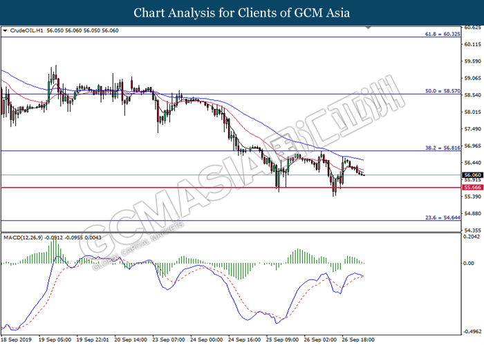 CrudeOIL, H1: Crude oil was traded lower following prior retracement from the higher level. MACD which illustrate diminishing bullish momentum with the starting formation of death cross suggest the commodity to extend its losses toward the support level at 55.65.