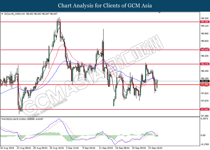 DOLLAR_INDX, H4: Dollar index was traded lower following prior retracement from resistance level at 98.15. However, MACD which illustrated bullish momentum suggest the pair to be traded higher in short-run as technical correction.