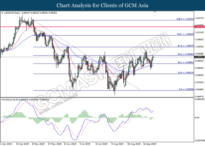 USDCHF, Daily: USDCHF was traded higher while currently testing the resistance level at 0.9945. MACD which illustrate diminishing bearish momentum suggest the pair to extend its gains after it successfully breakout above the resistance level at 0.9945.