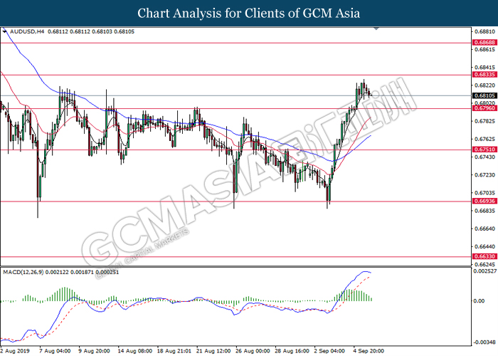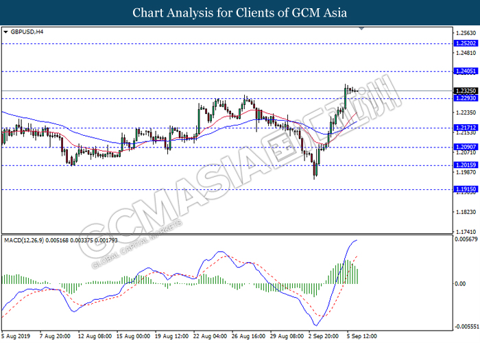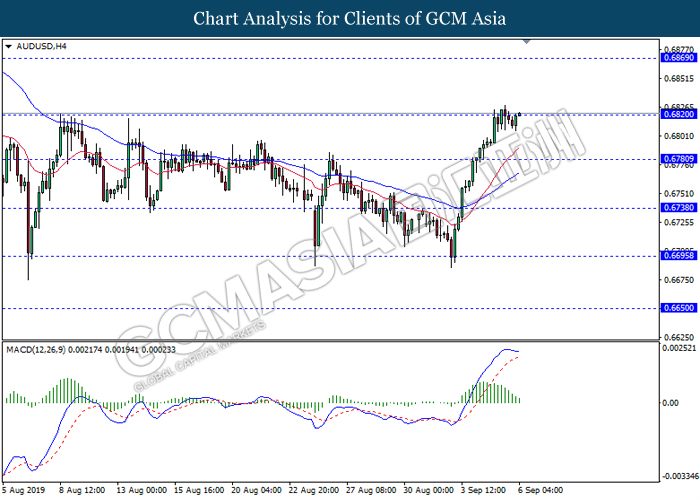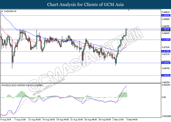 Pound sterling extended gains after British lawmakers approved legislation on Wednesday to extend the Brexit deadline for the third time and rejected Prime Minister Boris Johnson’s motion to hold a snap election. As market continues to see diminishing prospects for a disruptive ‘no deal’ Brexit taking place on October 31, analyst predicted Pound Sterling is expected to rally further. On the other hand, AUD/USD appreciate, amid doubts over the US-China trade optimism. According to economic data, the ongoing US-China trade tensions have been easing as potential meetings were discussed for mid-September between the U.S. and China. However, many investors are still difficult to be persuaded that the trade talks next month will advance the world economy. As of writing, AUD/USD appreciate 0.01% to 0.6812 while GBP/USD hovered at 1.2328.