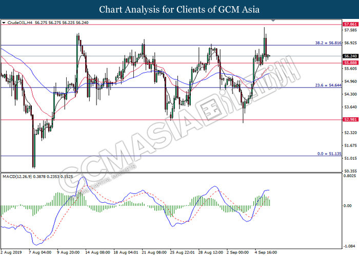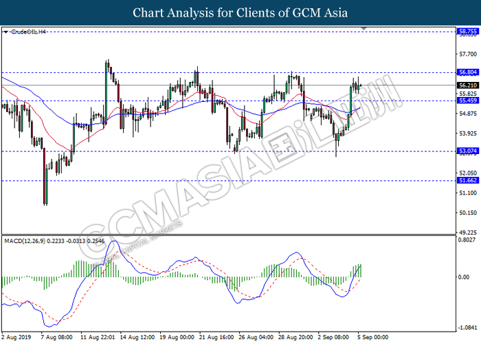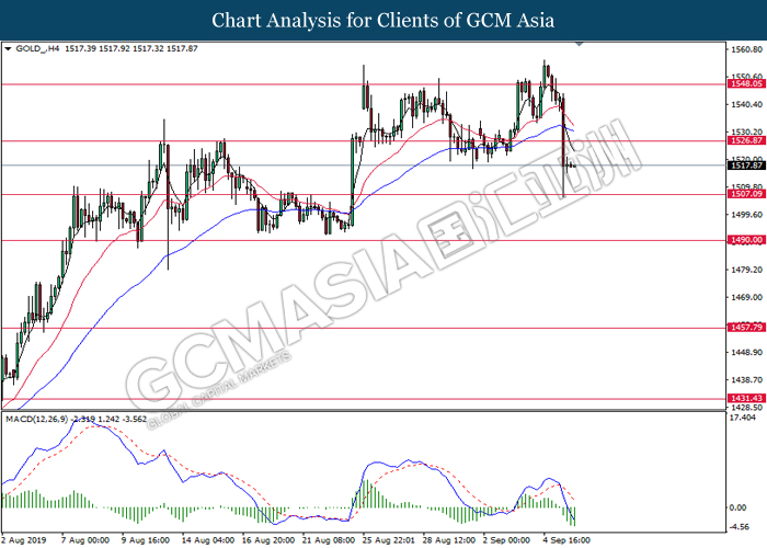 As for commodities, oil price fall 0.25% to $56.30 per barrel despite data showed a sign of large withdraw in crude oil inventories. According to Energy Information Administration (EIA), US crude oil inventories level dropped 4.771M, higher than economist expectation of -2.488M where market believe that the approach of hurricane Dorian was the factor caused the drop in US inventories. Besides, gold price inched down 0.03% to $1518.40 a troy ounce amid upbeat economic data from US region and sign of easing in trade war.