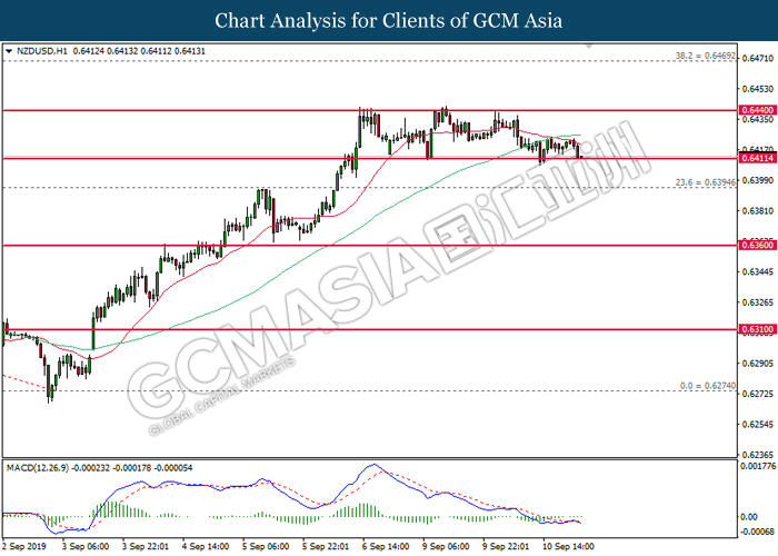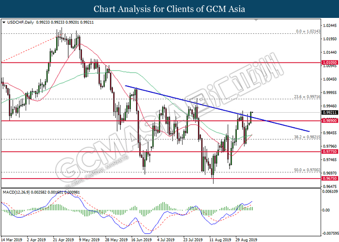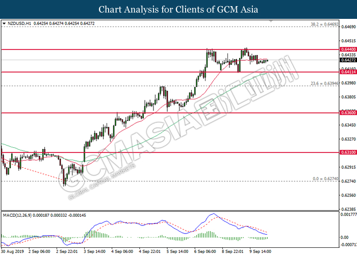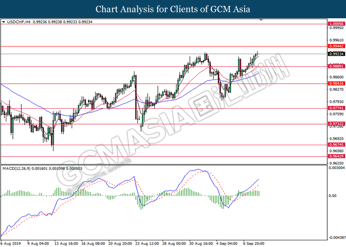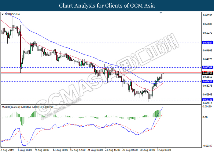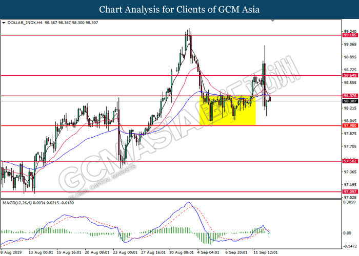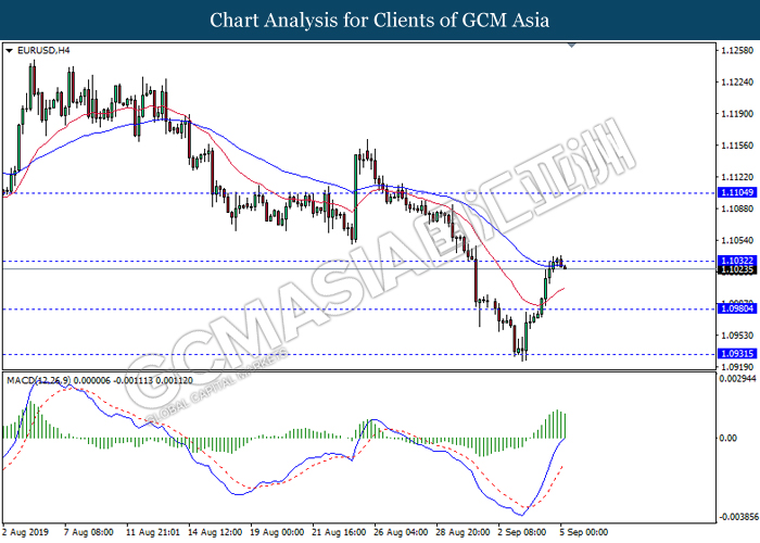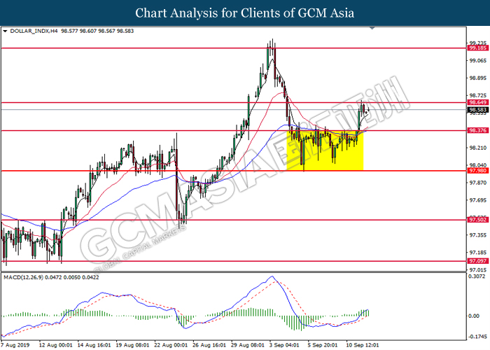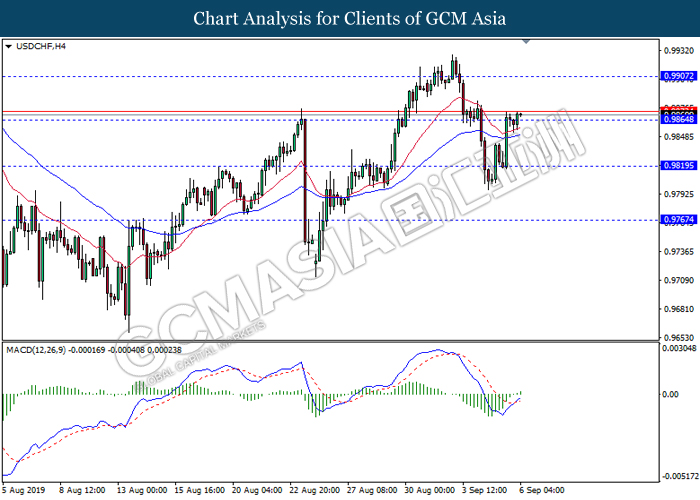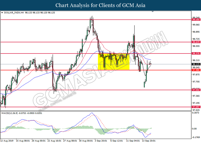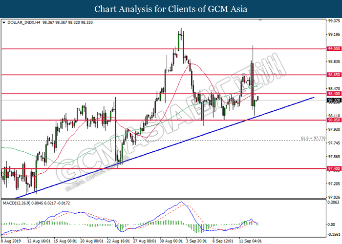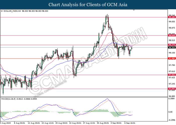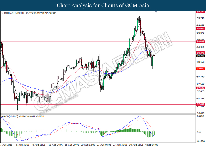 Dollar index which gauge its value against a basket of six major currencies rebounds from its one week low level amid easing in trade war and optimistic economic data been released last night. As a good predictor on gauging the Federal Reserve future stance, both ADP Nonfarm Employment Change and ISM Non-Manufacturing data came in at 195K and 56.4 respectively, beating the economist forecast of 148K and 54.0, dragged down the possibility of extending interest rate cut. Both data indicating that US economy is still remain resilient, labor market is still growing at healthy pace as compare to previous month, seemingly US did not affected as bad as market foresee despite recent tariff imposition and global weakness. Besides, the gains of dollar index dragged up more following improvement of trade sentiment between US and China. According to The Guardian, two largest economy bodies have agreed to reopen their trade talk next month as their concern over tariff imposition could push the global economy but not limited to both countries into recession. After a phone call on yesterday, they have decided to hold a senior level of meeting in early October while two countries will continue to hold discussions along the time to prepare for the talks. As of writing, dollar index rose 0.02% to 98.35.