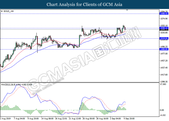 GOLD_, H4: Gold price was traded lower following recent retracement from the resistance level 1548.10. MACD which illustrate diminishing bullish momentum suggest the commodity to extend its retracement towards the support level 1519.00.
