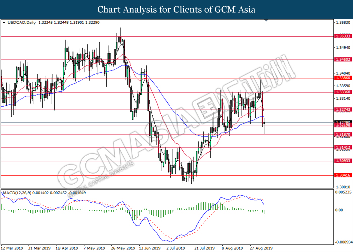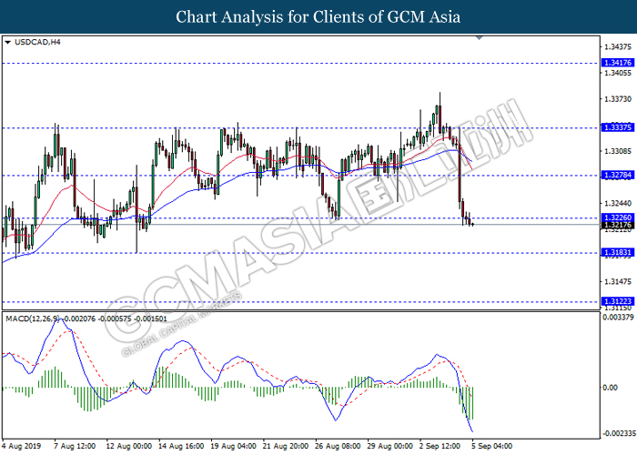 USDCAD, H1: USDCAD was traded lower following prior retrace from the upper level. MACD which illustrate bearish signal suggests the pair to be traded lower, towards the direction of 1.3220.