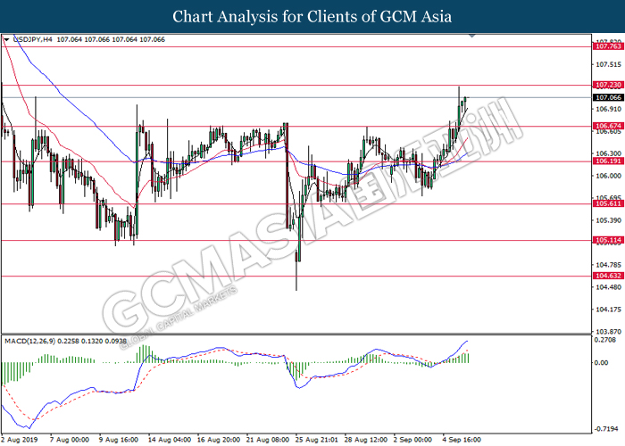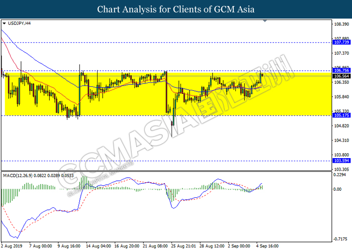 USDJPY, H4: USDJPY remain traded in a sideway channel while currently testing near the resistance level 106.75. However, MACD which illustrate bullish bias signal with the formation of golden cross suggest the pair to be traded higher after it breaks above the resistance level.