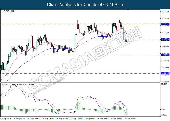GOLD_, H4: Gold price was traded lower following prior breakout below the previous support level 1519.00. MACD which illustrate ongoing bearish momentum suggest the commodity to extend its losses towards the support level 1488.85.