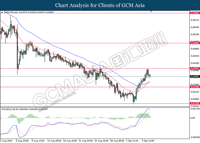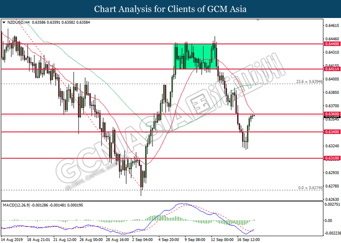 NZDUSD, H4: NZDUSD was traded higher while currently testing the resistance of 0.6360. MACD which illustrate bullish signal suggests the pair to extend its gains after closing above 0.6360.