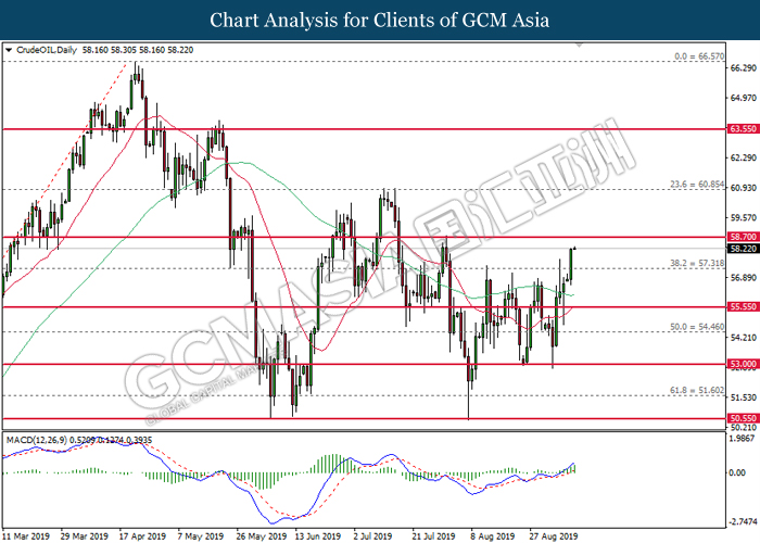 CrudeOIL, H1: Crude oil price was traded higher while currently testing the resistance of 58.70. MACD which illustrate diminished downward momentum suggests its price to be traded higher after closing above 58.70.