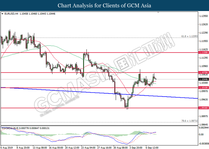 EURUSD, H4: EURUSD was traded lower while currently testing the support level at 1.1030. MACD which illustrate diminishing bullish momentum suggest the pair to extend its losses after successfully breakout below the support level at 1.1030.