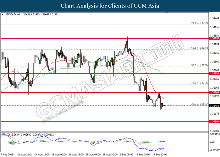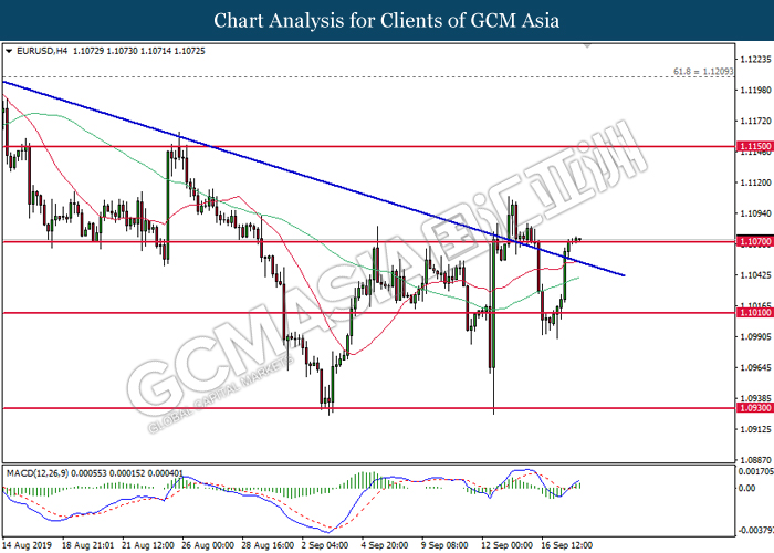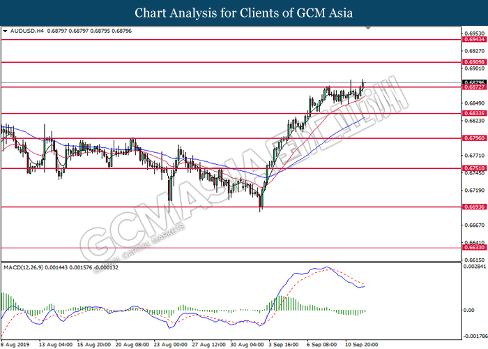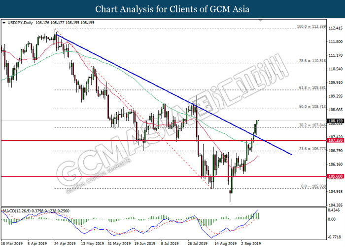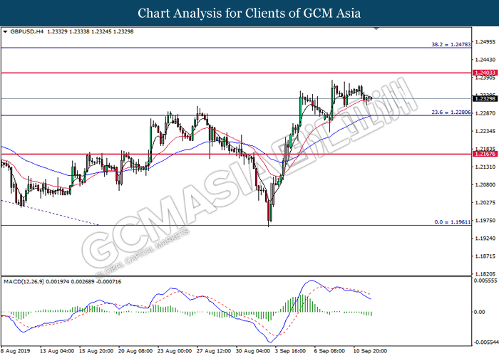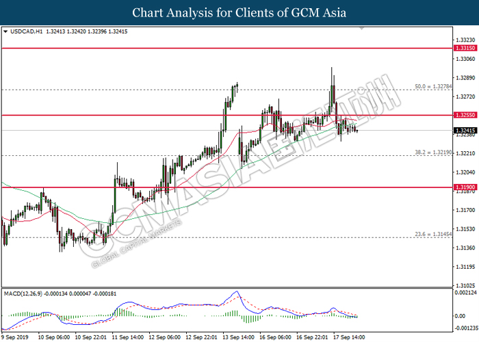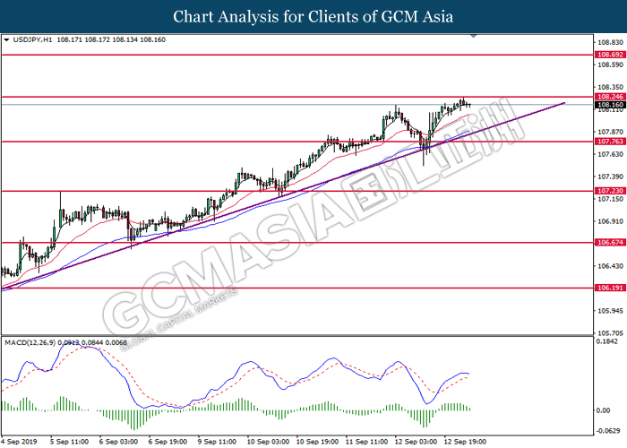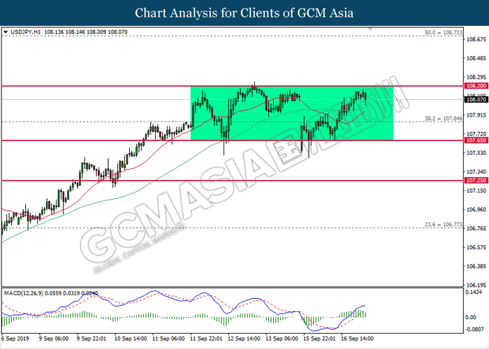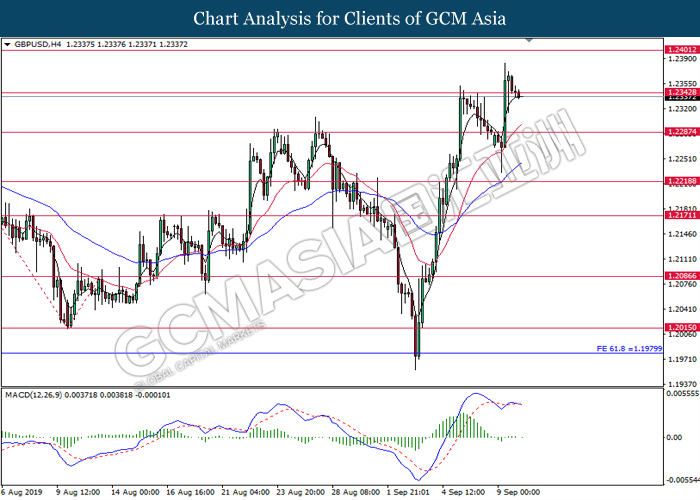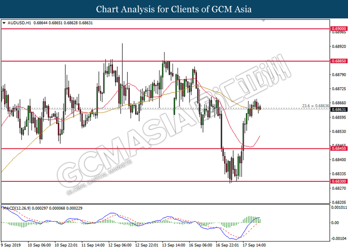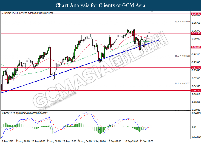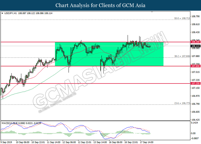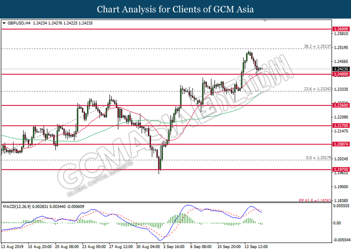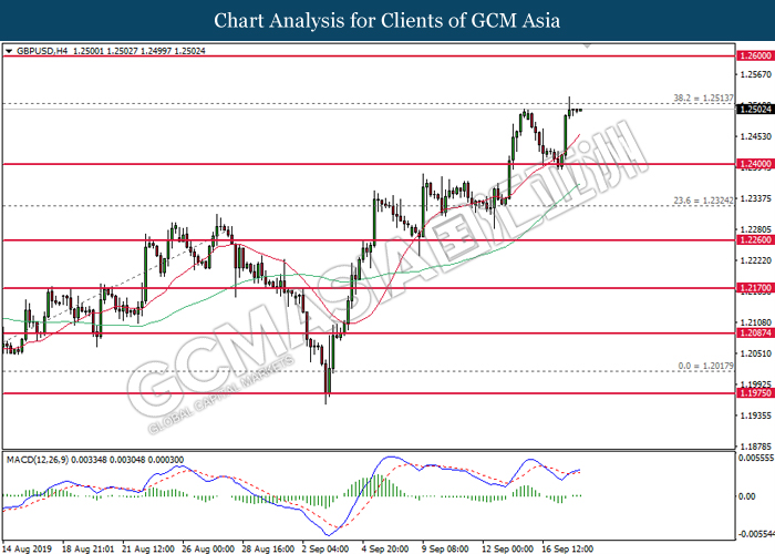 Greenback trims its gains on yesterday while market participants anticipates the release of interest rate decision from the Federal Reserve. As of writing, the dollar index was quoted down 0.40% to 97.73. According to Fed Rate Monitor Tool, investors are currently pricing in at 50.8% chance for a 25-basis point cut from 2.25% to 2.00%. However, most participants would be scrutinizing over Federal Reserve’s economic projection, statement as well as press conference chaired by Jerome Powell in order to gauge the central bank’s outlook upon US economy and future guidance. Substantially, losses on the greenback were limited after Industrial Production for the month of August rose 0.6%, seemingly higher than forecast of 0.2%. On the other hand, pair of GBP/USD ticks up 0.01% to 1.2499 during Asian trading session. On yesterday, the UK Supreme Court concluded its first day of a three days hearing with regards to PM UK Boris Johnson decision to suspend the parliament. The case may not only undermine his position as UK’s Prime Minister, it could also force him to retreat from the current legislative and give way to soft-Brexit supporters to pass through their laws.