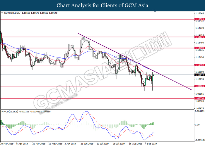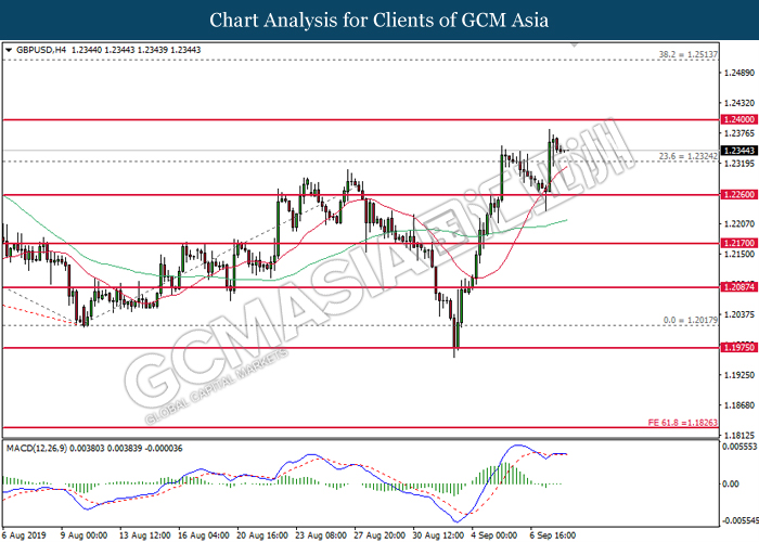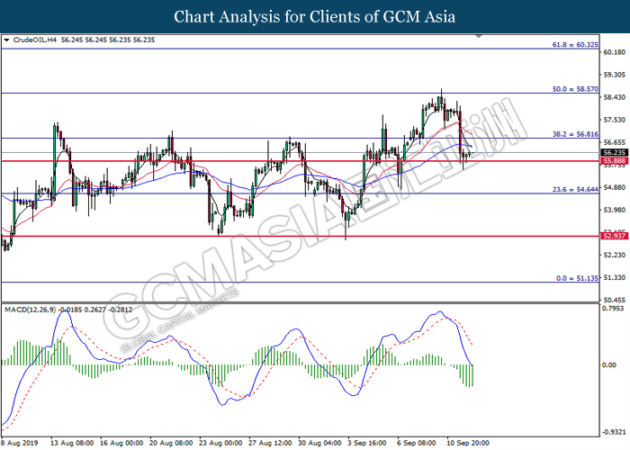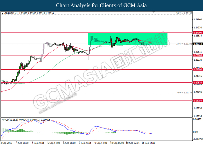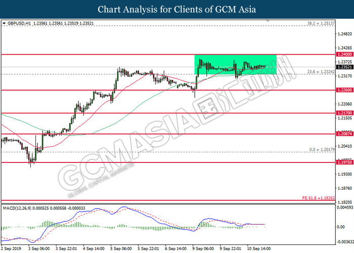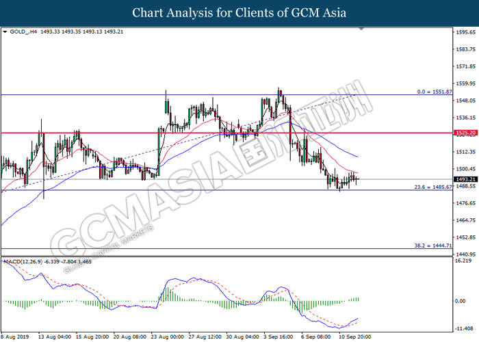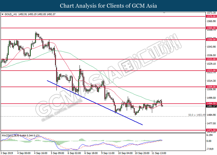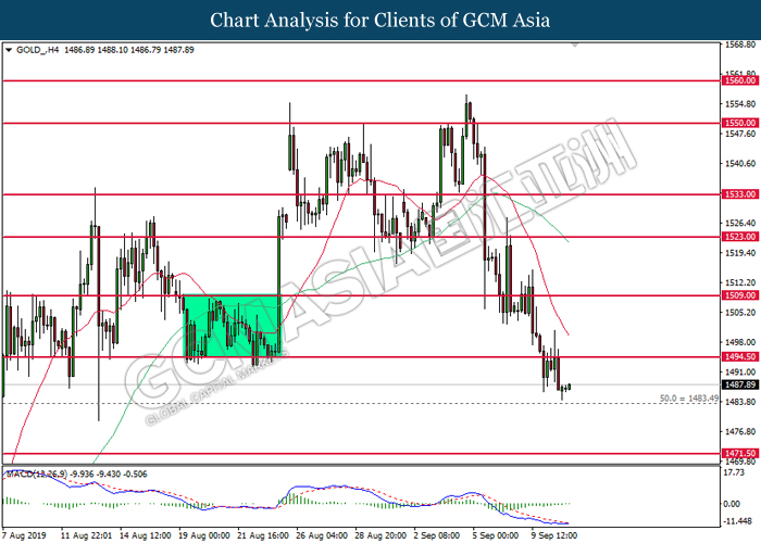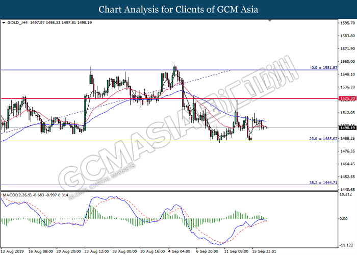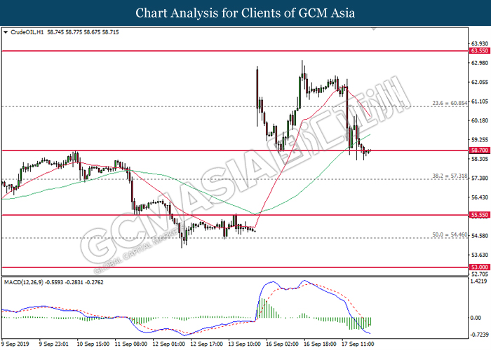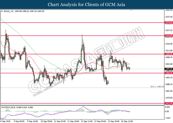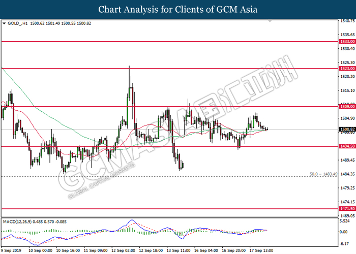 As for commodities, crude oil price extended gains by 0.03% to $61.87 per barrels. Oil prices continues to surge after Saudi oil company, Aramco commented that the recovery process on its oil facilities may take longer time than expected. Such signals suggest that oil production from Saudi Arabia may be jeopardize for a longer period of time. Otherwise, gold price was traded flat at $1,498.24 a troy ounce as investors wait for more signals from Fed interest rate decision this coming Thursday.