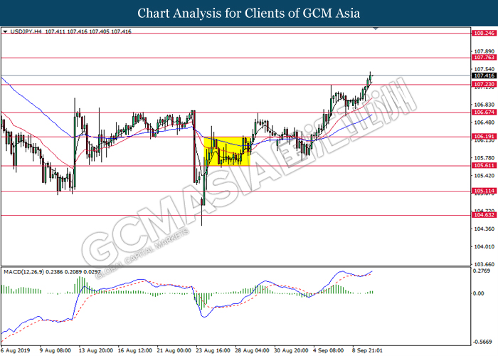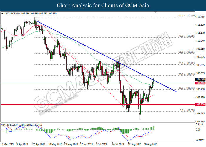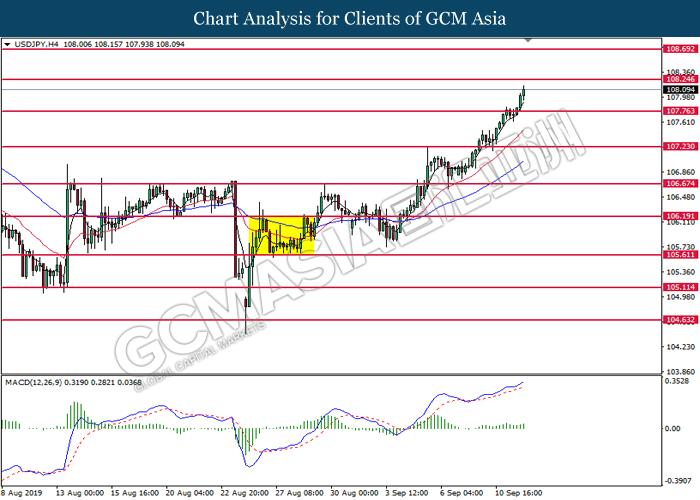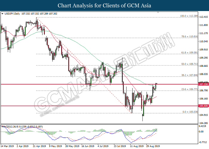 USDJPY, H4: USDJPY was traded higher while currently testing the resistance level at 108.25. MACD which illustrate diminished downward momentum suggests the pair to extend its gains after successfully breakout above the resistance level at 108.25.