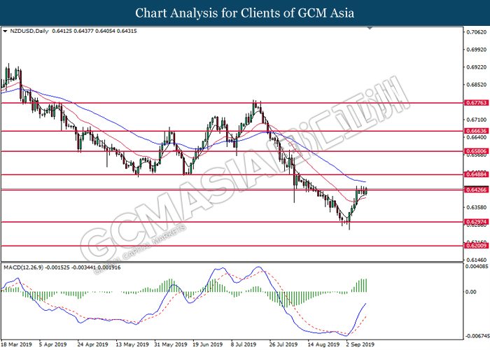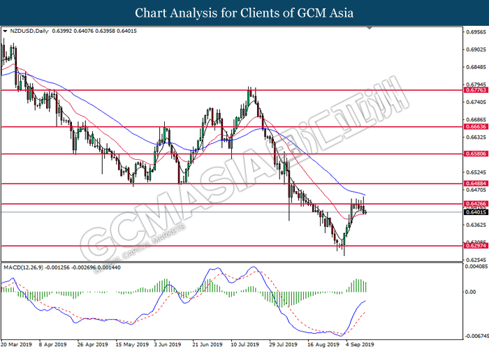 NZDUSD, Daily: NZDUSD was traded lower following prior retracement from the resistance level at 0.6425. MACD which illustrate bearish signal suggests the pair to advance further down, towards the direction of 0.6295.