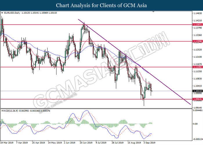 EURUSD, Daily: EURUSD was traded lower following prior retracement from the downward trendline. MACD which illustrate bearish signal suggests the pair to extend its losses, towards the direction of 1.0965.
