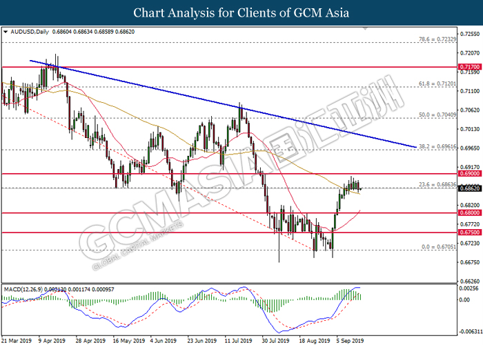 AUDUSD, H1: AUDUSD was traded lower while currently testing at the support of 0.6865. MACD which illustrate diminished upward momentum suggest the pair to extend its losses after closing below 0.6865.