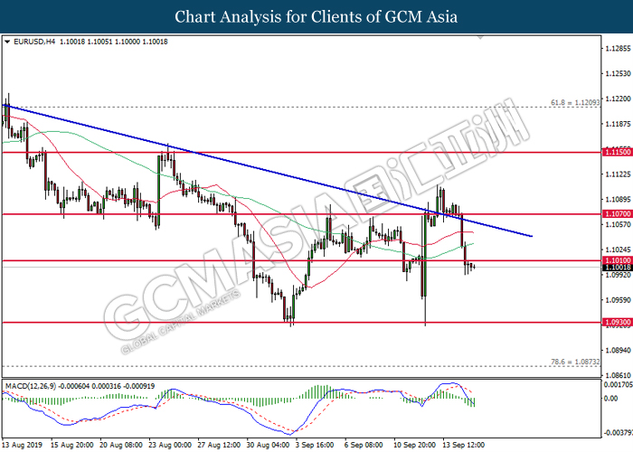 Japanese Yen appreciated against the U.S. dollar as geopolitical tensions escalated in the Middle East after the drone attacked on two major oil facilities in Saudi Arabia and destroyed the global oil supplies. The pre-dawn strikes on Saturday disrupted 5 percent of global oil supply and reduces the output of the crude oil by 5.7 million barrels per day. Yemen’s Houthi rebels claimed the responsibility for the attacks, warning Saudi Arabia that their target will be continually expanded. However, U.S. Secretary of State Mike Pompeo accused Iran of being behind the assault, without providing any evidence. The accused was then rejected by Tehran. Meanwhile, Saudi Arabia has promised to confront and deal with this terrorist aggression. The news intensifies tensions in the Middle East, providing bullish support for the Japanese Yen higher as it considered as safe-haven assets. However, with Bank of Japan is due to meet this week, investors speculate that the central bank may cut its interest rates further into negative territory to boost up the economic growth. On the other hand, EUR/USD slump as higher oil prices hurt the Europe’s balance of payments. As Europe imports most of its oil, rising oil price on a supply shock would increase the cost of import and lead to further depreciation in EUR/USD. As of writing, USD/JPY rose 0.02% to 108.10 and EUR/USD appreciated by 0.12% to 1.1001.