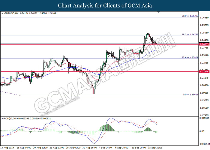 GBPUSD, H4: GBPUSD was traded lower while currently testing the support level at 1.2405. MACD which illustrate bearish signal suggests the pair to extend its losses after successfully breakout below the support level at 1.2405.