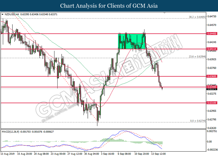 NZDUSD, H4: NZDUSD was traded lower following prior retracement from the resistance level at 0.6395. MACD which illustrate diminishing bullish momentum suggests the pair to extend its losses toward the support level at 0.6330.