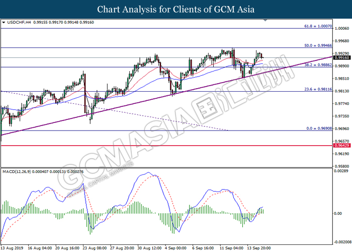 USDCHF, H4: USDCHF was traded lower following prior retrace from its higher levels. MACD which illustrate diminished upward momentum suggests the pair to extend its losses toward the support level at 0.9885.