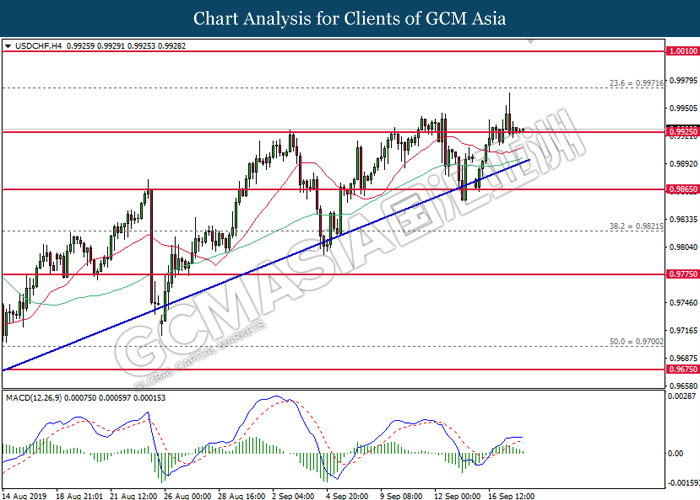 USDCHF, H4: USDCHF was traded lower while currently testing at the support of 0.9925. MACD which illustrate diminished upward momentum suggests the pair to be traded lower after closing below 0.9925.