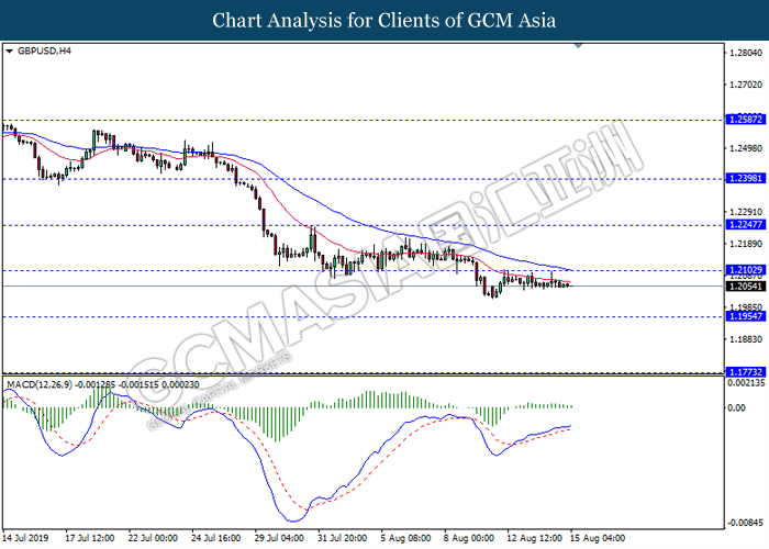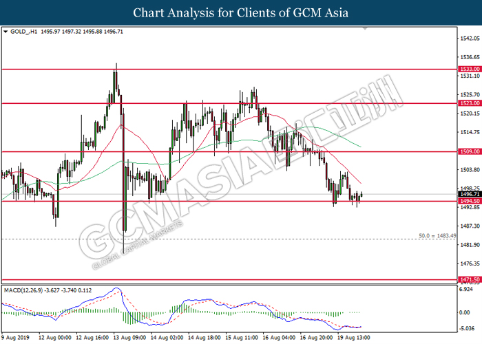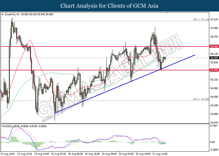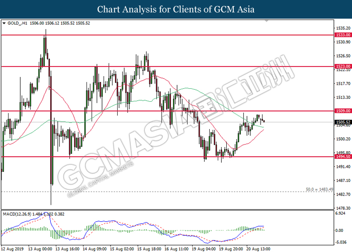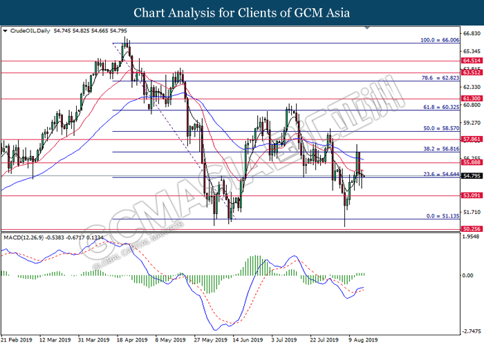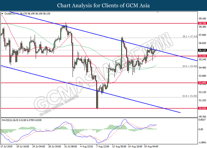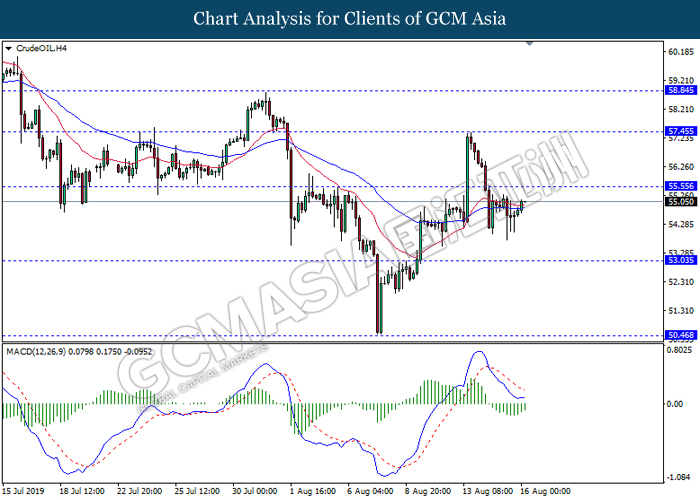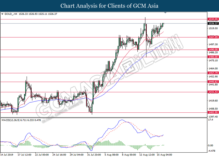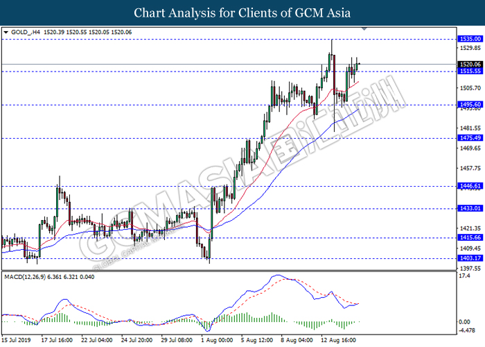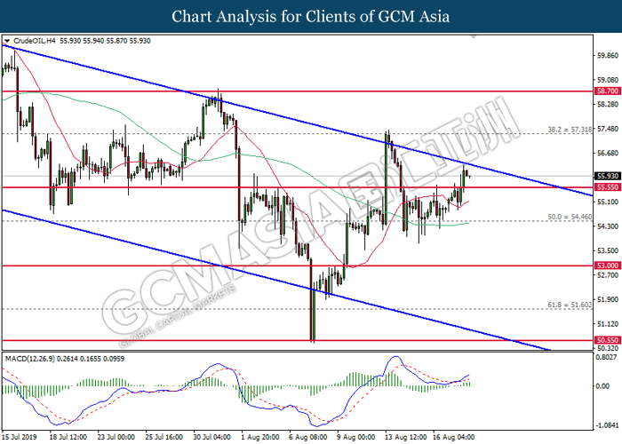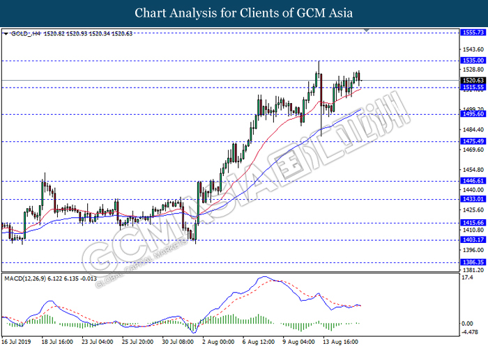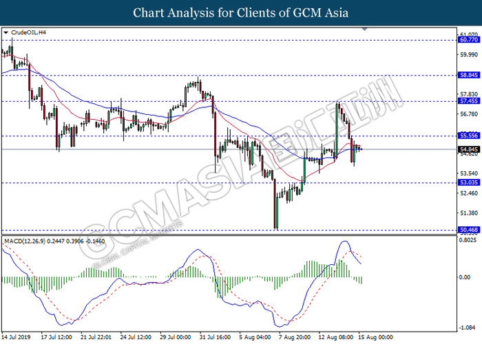 In the commodities market, crude oil price rose by 0.20% to $54.80 per barrel despite China reported disappointing data for July. Yesterday China released surprise drop in industrial output growth data to a more than 17 year low due to escalation of trade war. On the other hand, gold price ticked up by 0.18% to $1525.95 a troy ounce amid market sentiment remain negative toward riskier asset.