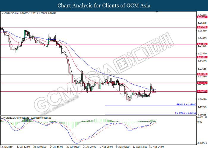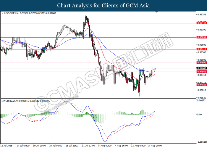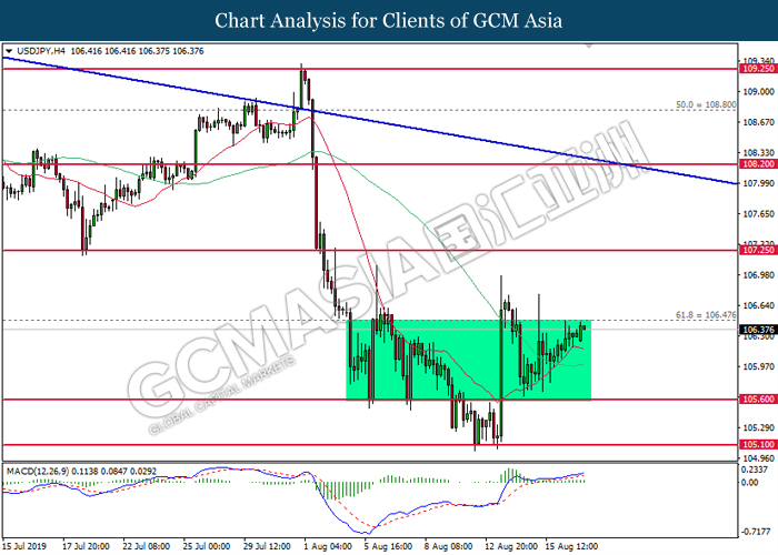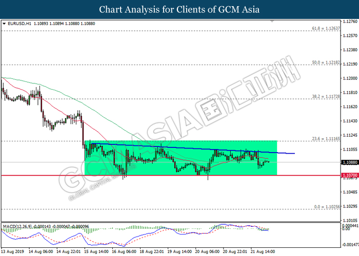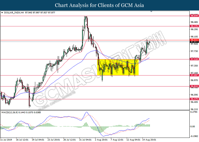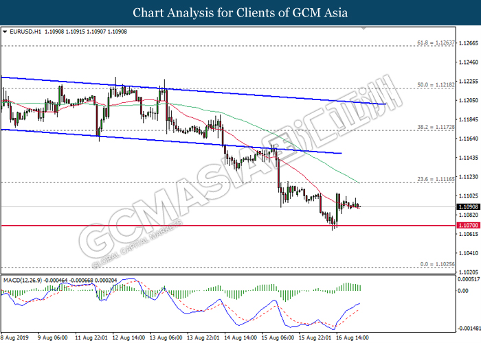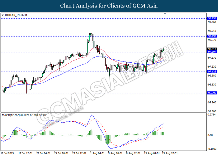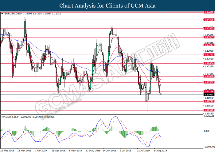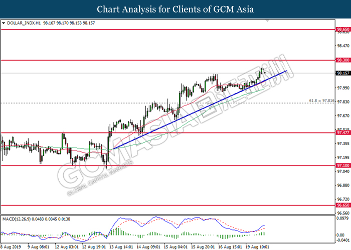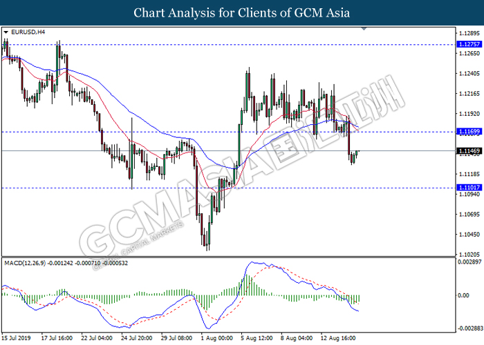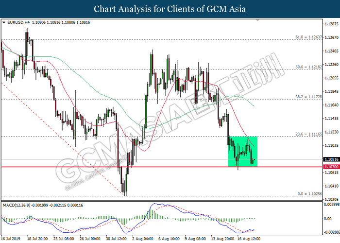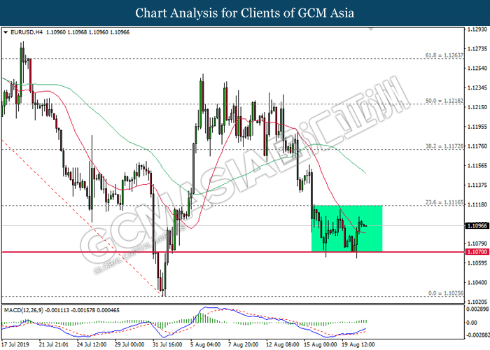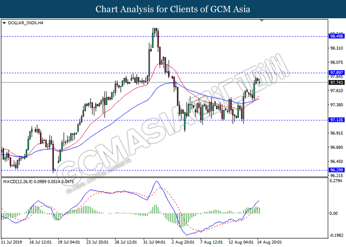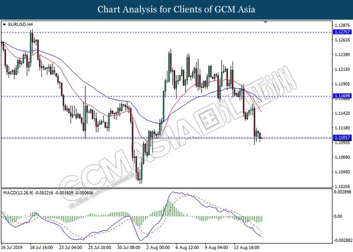 Dollar index which gauge its value against a basket of six major currencies rose amid release of a batch of upbeat economic data from US region tempered the market concern over US economy recession risk. According to the Census Bureau, US Core Retail Sales data came in at 1.0%, beating the economist forecast of 0.4% only while it indicating that the US economy is still remain favorable as consumer spending had strengthen. Besides, US Philadelphia Fed Manufacturing Index also further support the dollar index against other currencies where it showed a reading of 16.8 versus economist forecast of 10.0. This robust data indicates that business conditions in US has improved and seemingly local companies did not affected much by the heightening trade tensions between US and China. Besides, series of ‘healthy’ economic data throughout this entire week so far has lowered down the investor expectation regarding to the possibility of 0.25% rate cut in September from 75.4% to 73.1%. During early Asian trading session, dollar index ticked up 0.01% to 97.95. On the other hand, the pair of EUR/USD quoted up 0.02% to 1.1105 after plunging for more than 600 basis point following dovish statement from ECB’s committee member Olli Rehn. According to an interview conducted by Wall Street Journal, ECB will announced a package of stimulus measures at its next policy meeting in September that should exceed the expectation of investors, revealed by ECB’s member. Thus, a further rate cut and more substantial bond purchases can be expected to implement by ECB in order to support the Eurozone economy slowing.