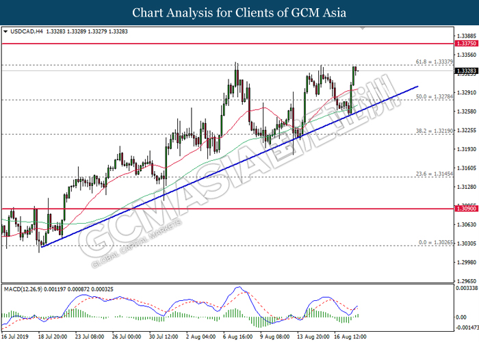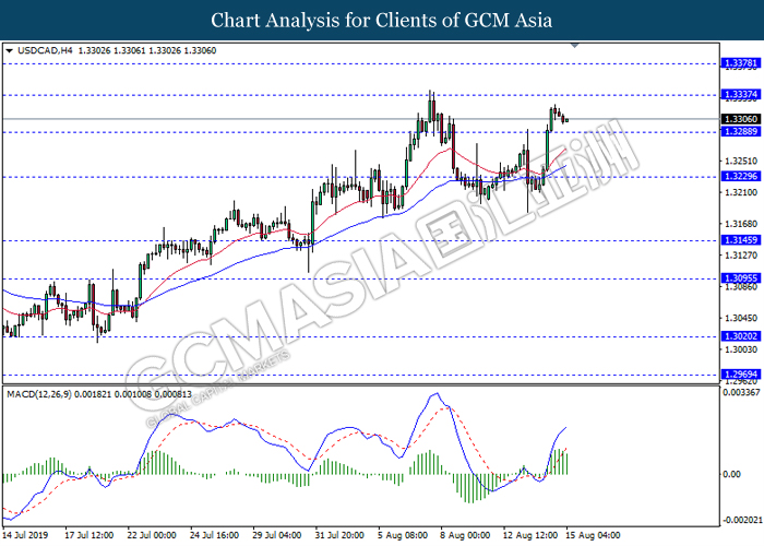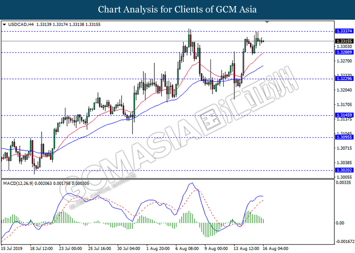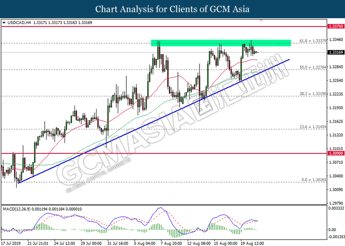 USDCAD, H4: USDCAD was traded lower following prior retracement from its high level. MACD which display diminishing bullish momentum suggest the pair to extend its retracement towards the support level 1.3290.