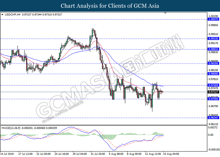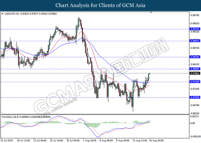 USDCHF, H4: USDCHF was traded higher following prior breakout above the previous resistance level at 0.9755. MACD which display bullish momentum suggest the pair to extend its gains toward the resistance level at 0.9790.