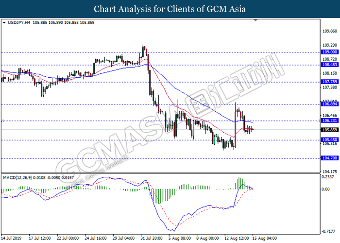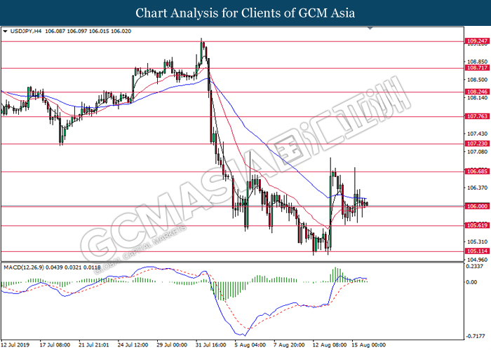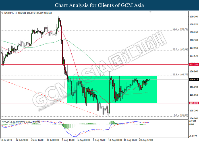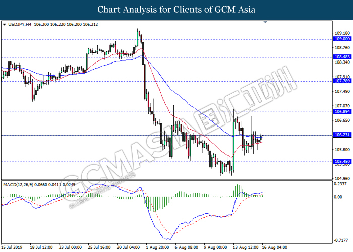 USDJPY, H4: USDJPY was traded higher while currently testing near the resistance of 106.50. MACD which illustrate bullish signal suggests the pair to extend its gains after breaking the target at 106.50.
