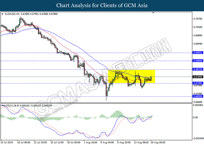 AUDUSD, H4: AUDUSD remain traded in a sideway channel following recent rebound form the support level 0.6760. MACD which illustrate bullish momentum signals suggest the pair to be traded higher towards the resistance level 0.6825.