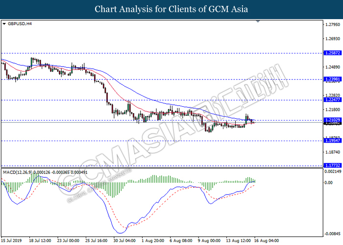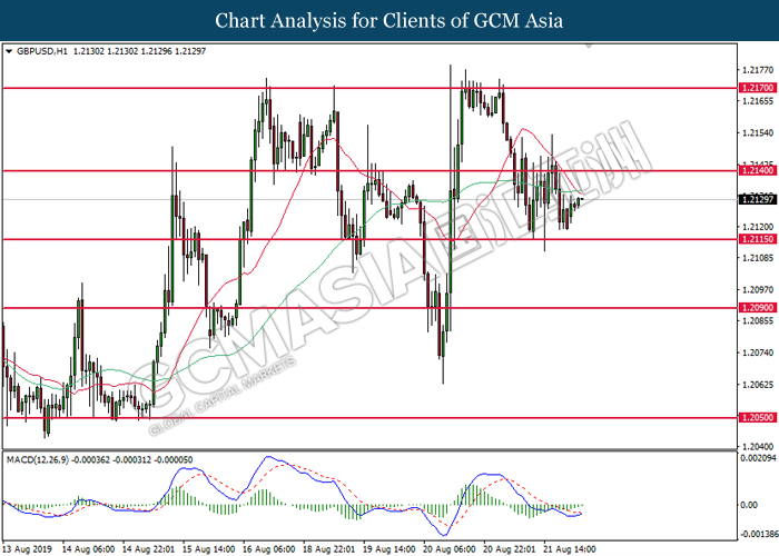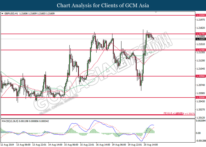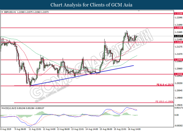GBPUSD, H1: GBPUSD was traded higher following prior rebound from the support level of 1.2140. MACD which illustrate diminished downward momentum suggests the pair to extend its gains, towards the direction of 1.2180.