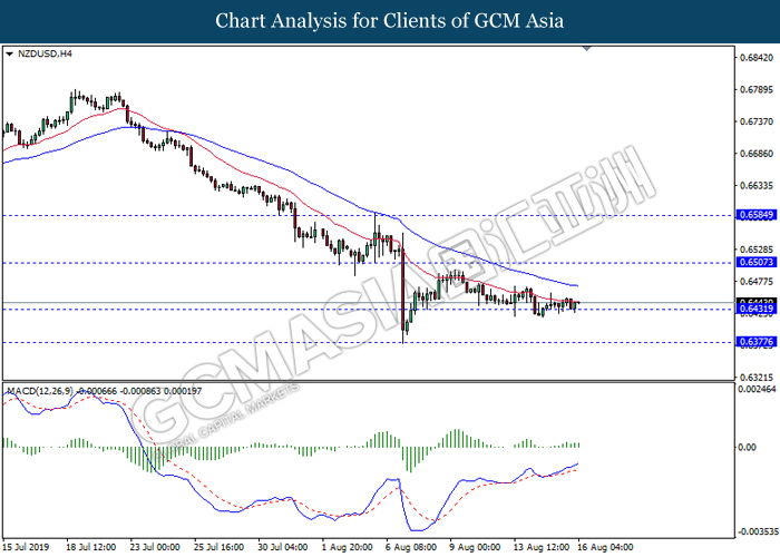 NZDUSD, H4: NZDUSD was traded lower while currently testing the support level 0.6375. MACD which illustrate bearish bias signal suggest the pair to extend its losses after it breaks below the support level.