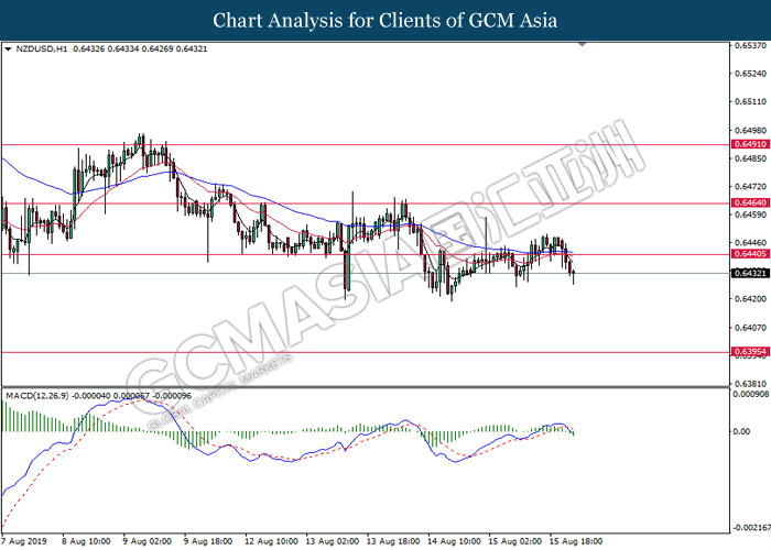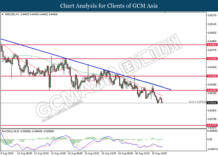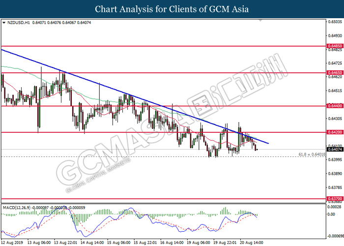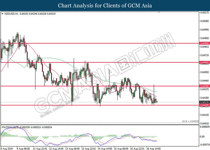 NZDUSD, H1: NZDUSD was traded lower while currently testing at the support of 0.6420. MACD which illustrate bearish signal suggests the pair to advance further down after closing below the support level.
