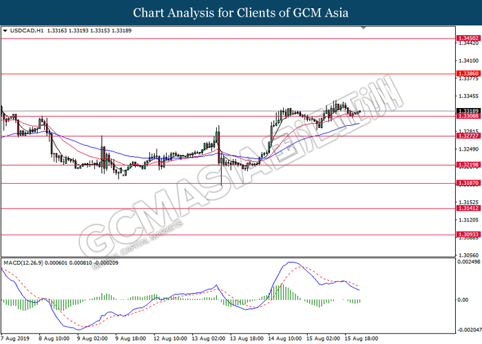 USDCAD, H1: USDCAD was traded higher following prior rebound from the support level at 1.3310. MACD which illustrate diminished bearish momentum suggest the pair to extend its gains toward the resistance level at 1.3385.