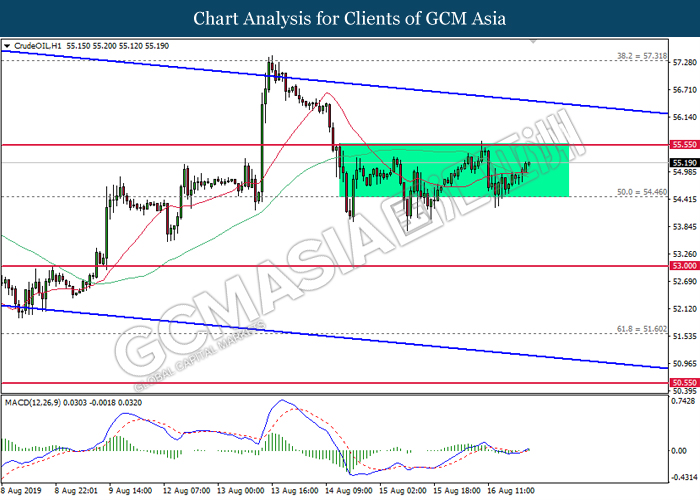 CrudeOIL, H1: Crude oil price was traded higher following prior rebound from the lower level. MACD which illustrate bullish signal suggests its price to be traded higher, towards the direction of 55.55.