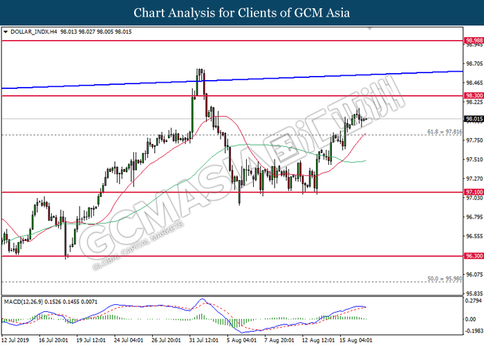 DOLLAR_INDX, H4: Dollar index was traded higher while currently testing the resistance level at 98.00. MACD which illustrate persistent bullish momentum suggest index to extend its gains after successfully breakout above the resistance level at 98.00.