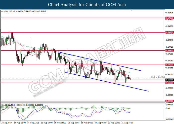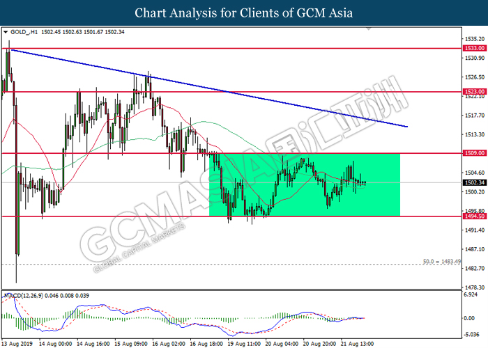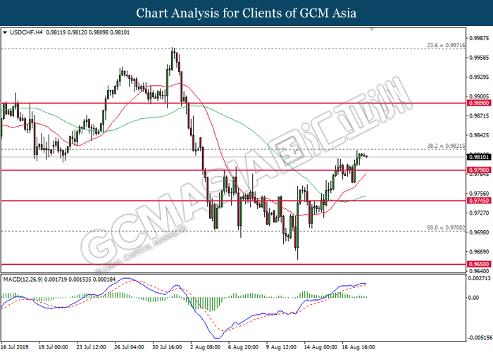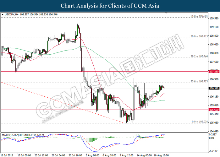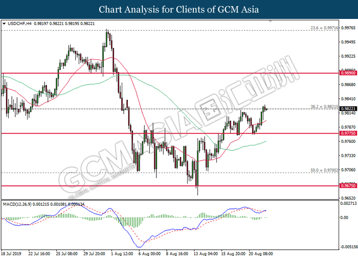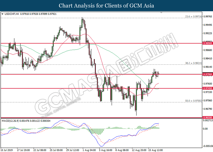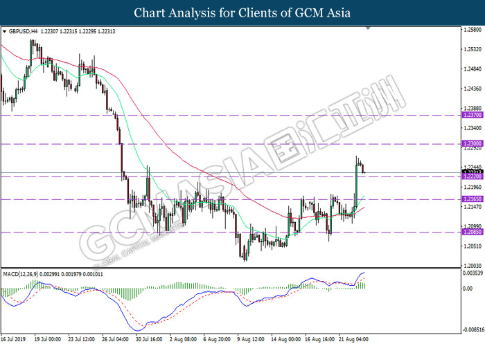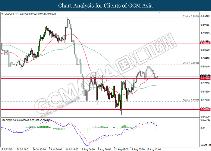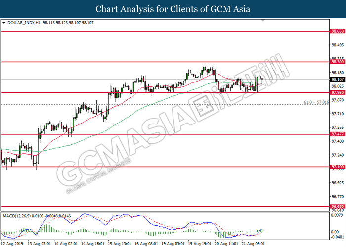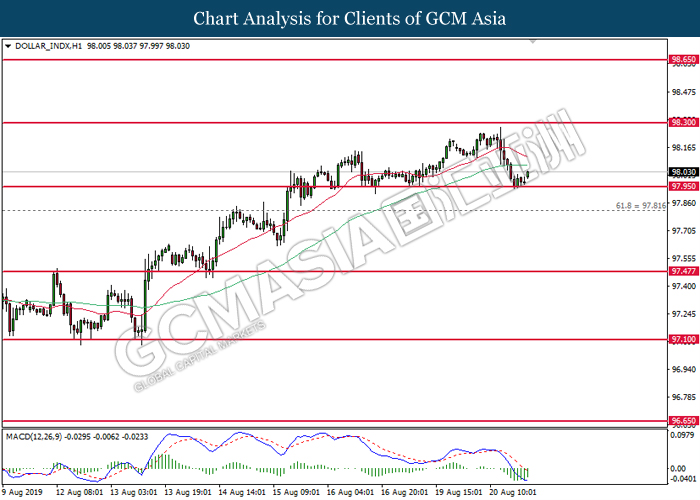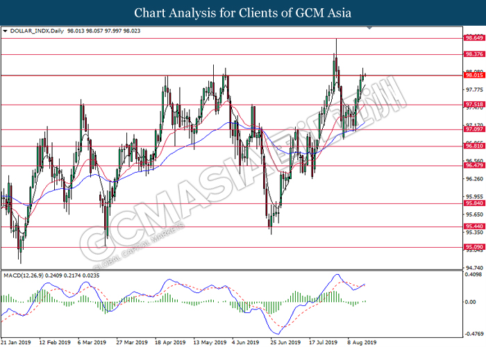 Dollar index which gauge its value against a basket of six major currencies rose following hawkish comment from President of Fed Bank of Philadelphia. In an interview with CNBC, Fed Harker commented that he is reluctant to see further rate cut since the economy remains resilient and does not need more stimulus as of now. This comment has dragged down the market expectation on further rate cut to 90% from 100% previously while minority of them shifted their view to probability of no rate cut during the September Fed meeting. Nonetheless, market are still keeping their eye on Jerome Powell Speaks as it will provide a clearer signal on interest rate decision. During Asian trading session, dollar index inched up 0.15% to $98.15. On the other hand, the pair of GBP/USD quoted down 0.13% to 1.2235 after hitting 3 weeks high supported by optimistic comment on Irish backstop issue from German Chancellor Angela Merkel. Yesterday, Angela Merkel revealed that the Irish backstop may possibly be solved before the deadline of 31th October, signaling her willingness to compromise with Boris Johnson. This news has lifted up market’s expectation of a soft Brexit as U.K lawmakers may approve the draft without border issue.