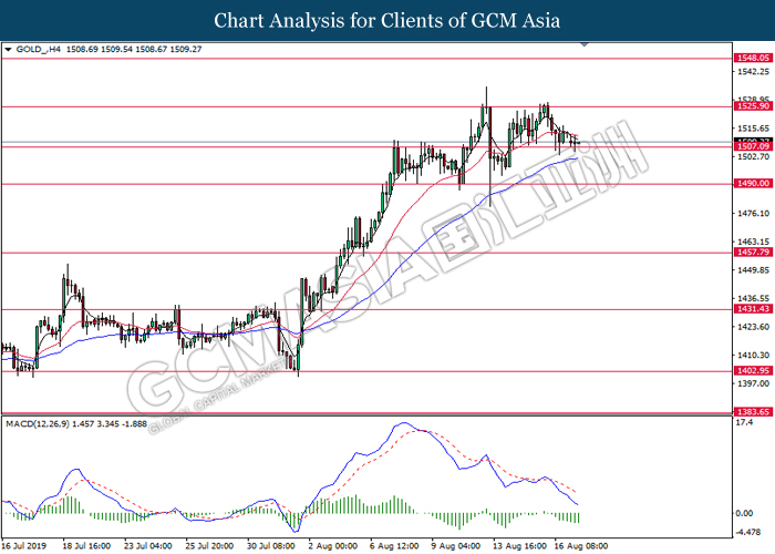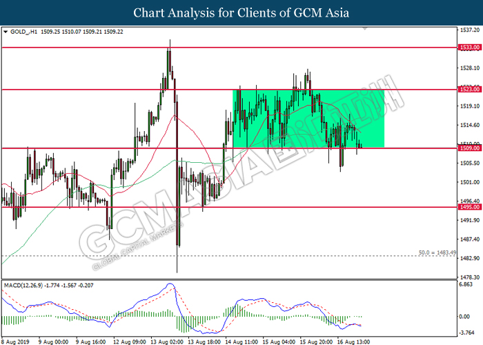 GOLD_, H1: Gold price was traded lower while currently testing at the support of 1509.00. MACD which illustrate bearish signal suggests its price to be traded lower after breaking the target at 1509.00.