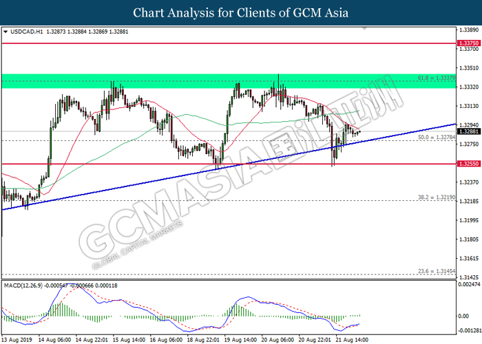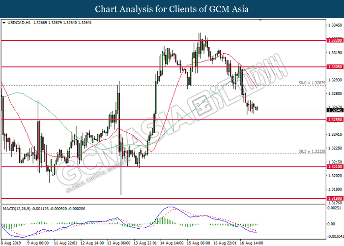 USDCAD, H1: USDCAD was traded lower following prior close below 1.3290. MACD which illustrate bearish signal suggests the pair to extend its losses, towards the direction of 1.3255.
